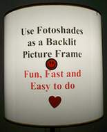 Fotoshades makes a great picture frame.  It is easy to mount, display and illuminate your own pictures. Just follow the easy steps below.  It is fun, fast, easy and inexpensive to do.  Just print your own pictures on standard photo paper, see below for best paper to use, and slide the picture onto the shade.