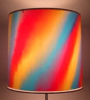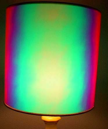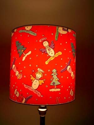 Here is a Christmas lampshade made by wrapping standard Christmas wrap around the Fotoshades. The wrapping paper was bought at the drug store for only $2.00 per roll. For best results, wrapping paper must not have a foil backing. Thin translucent paper works best. Hold the paper to the light to see if light passes through it.