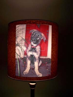 Here is a shade with a picture of my dog printed on my home computer printer on overhead projector film. The picture was taken with a digital camera. The matting around the picture is brown craft paper, (grocery bag paper). When light passes through the brown craft paper it makes the paper look like cork. This shade and picture was very inexpensive to make, $1.00 for the overhead projector film and 24 cents for the craft paper. The picture is a 8" x 12" size.