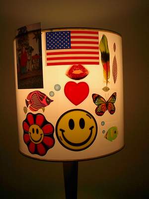 Here is a shade with different kinds of stickers and other items. Stickers can be used to accent your shade with pictures or other wraps. Here are the different types of stickers. The U.S. flag, heart, and smiley face are "Window Clings", they have n o adhesive and can be removed easily. You can find window clings at most Hobby Stores. The butterfly is a decal, the fish is a sticker, a real parrot feather and the red lips are liquid filled that are stuck on the outside of the clear plastic pane. There are many things that can be used on the shade to personalize it more.